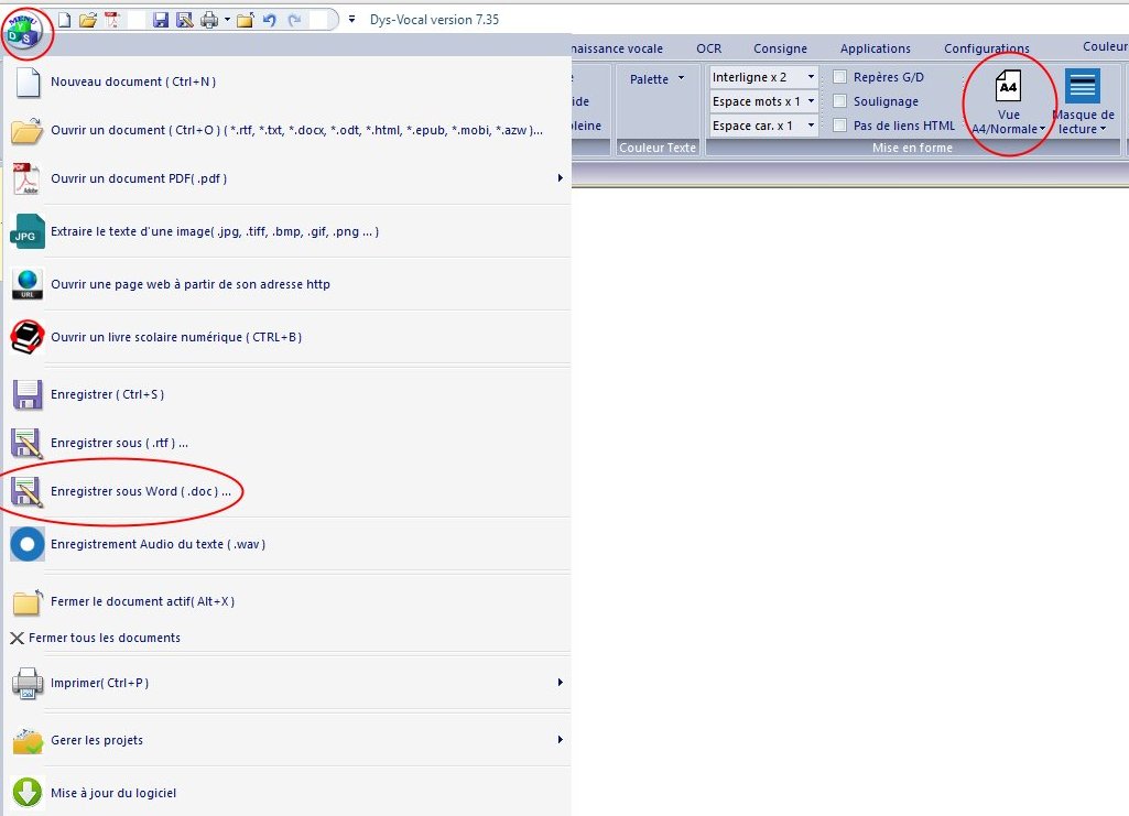 S’il s’agit de pouvoir imprimer le document, vous pouvez le faire directement dans l’interface Dys-Vocal en ayant auparavant sélectionné la « Vue A4 » dans le menu Edition